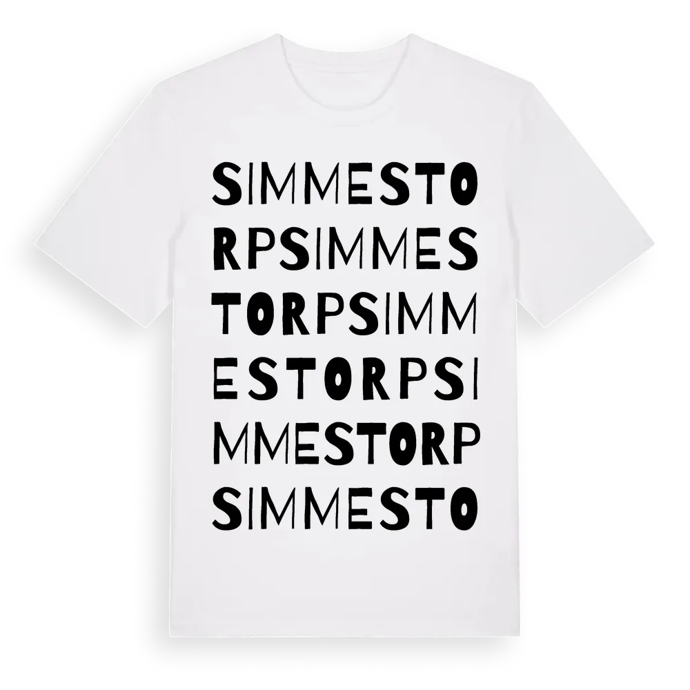 Simmestorp ordlek t-shirt är inspirerad av Simmestorp i Västra Götalands län, Sverige. Tröjan är designad för dig som har en speciell koppling till platsen – oavsett om du bor här, har rötterna här eller bara älskar Simmestorp.