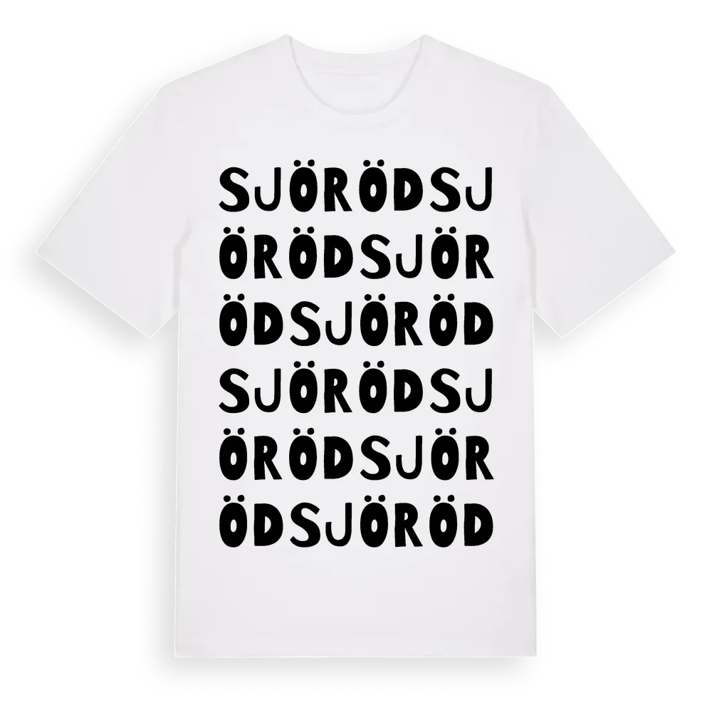 Sjöröd ordlek t-shirt är inspirerad av Sjöröd i Västra Götalands län, Sverige. Tröjan är designad för dig som har en speciell koppling till platsen – oavsett om du bor här, har rötterna här eller bara älskar Sjöröd.