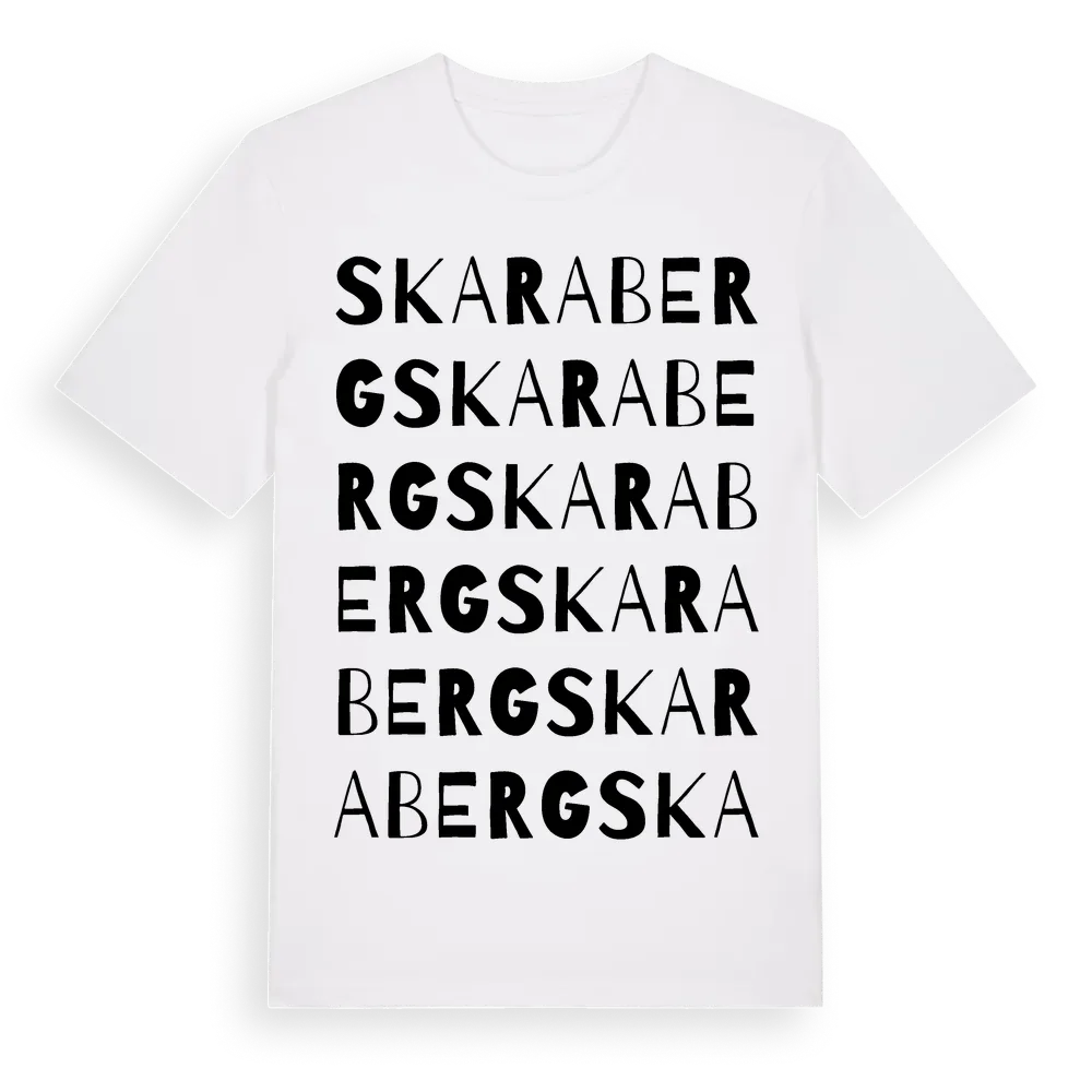 Skaraberg ordlek t-shirt är inspirerad av stadsdelen Skaraberg i Västra Götalands län, Sverige. Tröjan är designad för dig som har en speciell koppling till platsen – oavsett om du bor här, har rötterna här eller bara älskar Skaraberg.