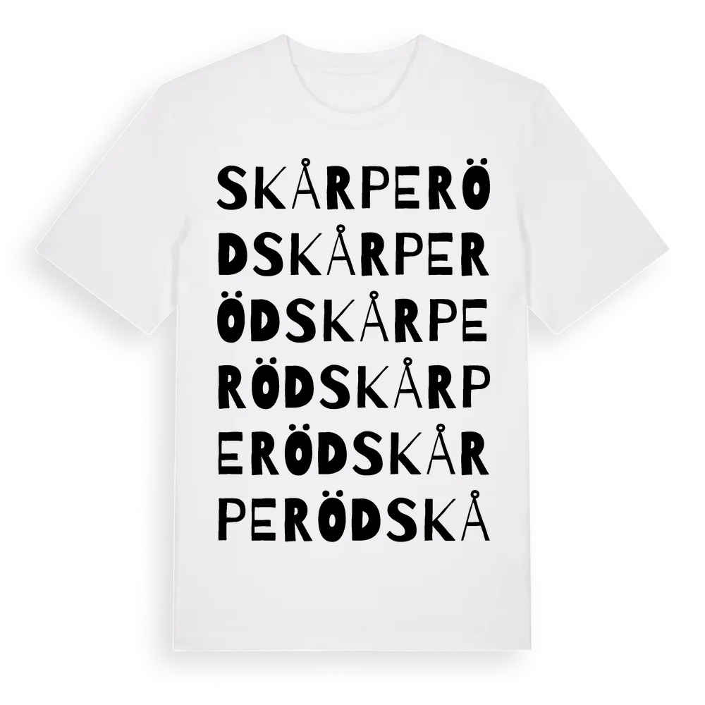 Skårperöd ordlek t-shirt är inspirerad av byn Skårperöd i Västra Götalands län, Sverige. Tröjan är designad för dig som har en speciell koppling till platsen – oavsett om du bor här, har rötterna här eller bara älskar Skårperöd.
