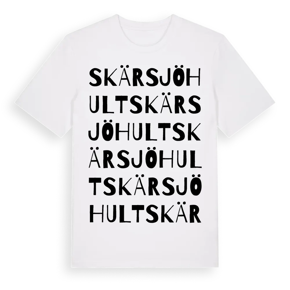 Skärsjöhult ordlek t-shirt är inspirerad av Skärsjöhult i Västra Götalands län, Sverige. Tröjan är designad för dig som har en speciell koppling till platsen – oavsett om du bor här, har rötterna här eller bara älskar Skärsjöhult.
