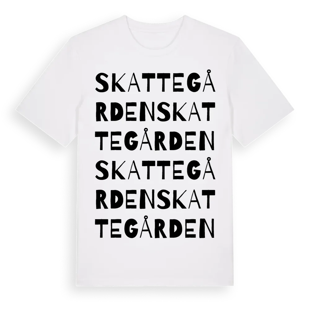 Skattegården ordlek t-shirt är inspirerad av Skattegården i Västra Götalands län, Sverige. Tröjan är designad för dig som har en speciell koppling till platsen – oavsett om du bor här, har rötterna här eller bara älskar Skattegården.