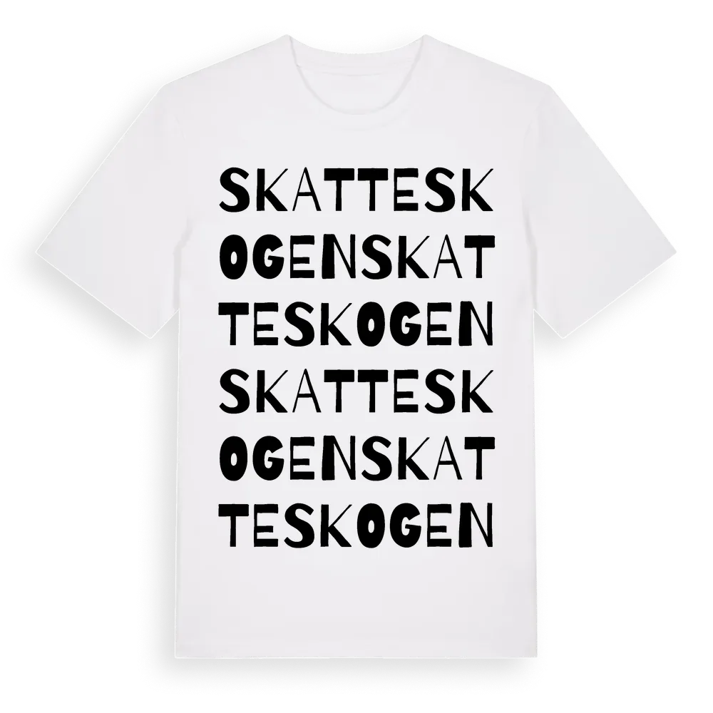 Skatteskogen ordlek t-shirt är inspirerad av Skatteskogen i Västra Götalands län, Sverige. Tröjan är designad för dig som har en speciell koppling till platsen – oavsett om du bor här, har rötterna här eller bara älskar Skatteskogen.