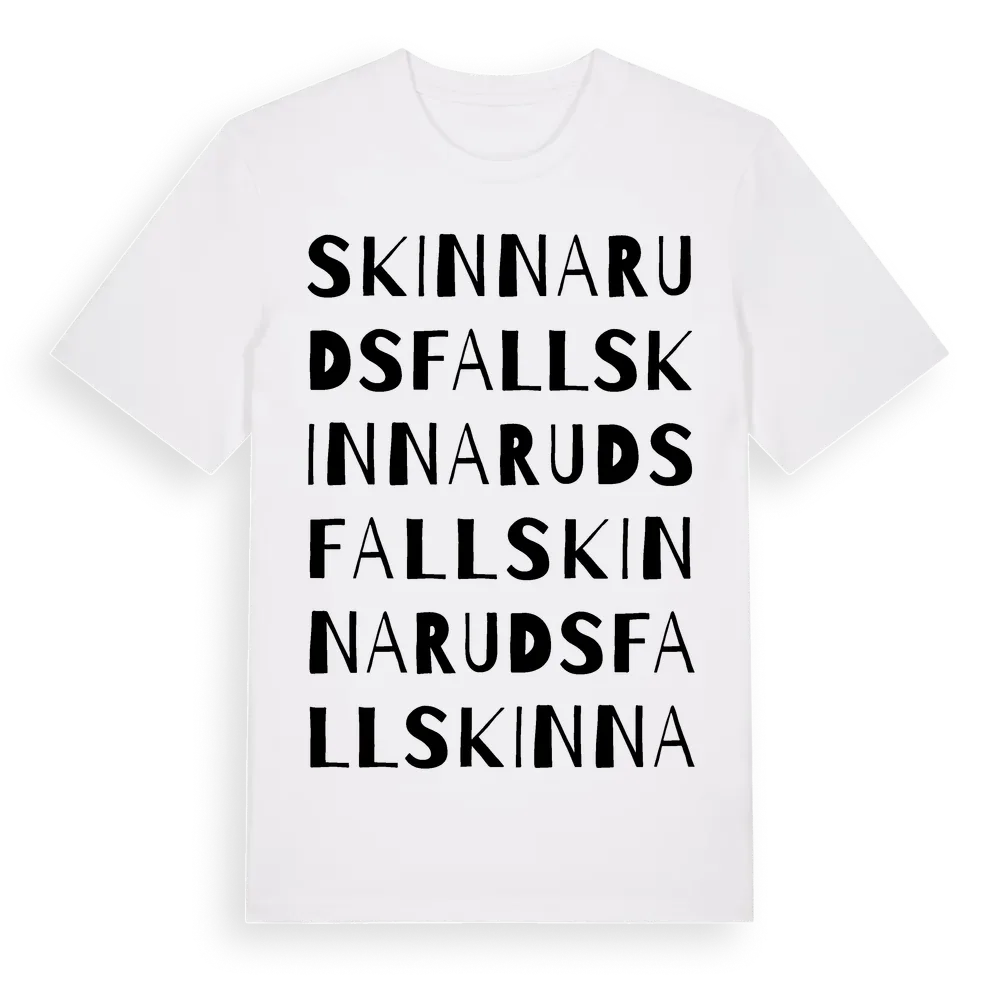 Skinnarudsfall ordlek t-shirt är inspirerad av Skinnarudsfall i Västra Götalands län, Sverige. Tröjan är designad för dig som har en speciell koppling till platsen – oavsett om du bor här, har rötterna här eller bara älskar Skinnarudsfall.