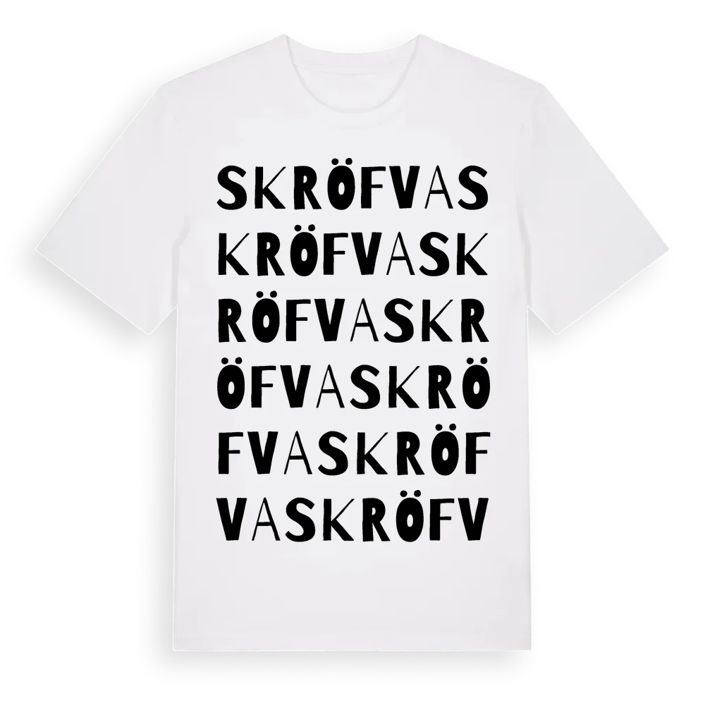 Skröfva ordlek t-shirt är inspirerad av Skröfva i Västra Götalands län, Sverige. Tröjan är designad för dig som har en speciell koppling till platsen – oavsett om du bor här, har rötterna här eller bara älskar Skröfva.