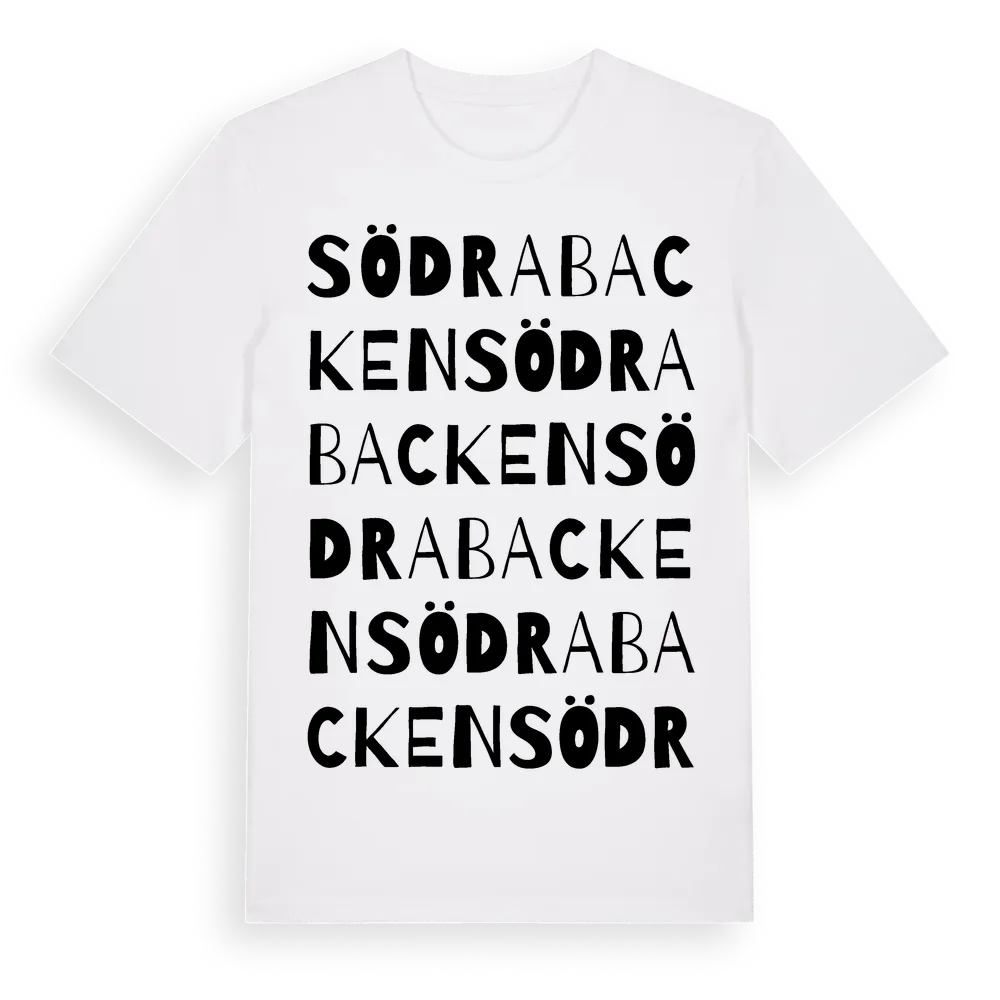 Södra Backen ordlek t-shirt är inspirerad av byn Södra Backen i Västra Götalands län, Sverige. Tröjan är designad för dig som har en speciell koppling till platsen – oavsett om du bor här, har rötterna här eller bara älskar Södra Backen.
