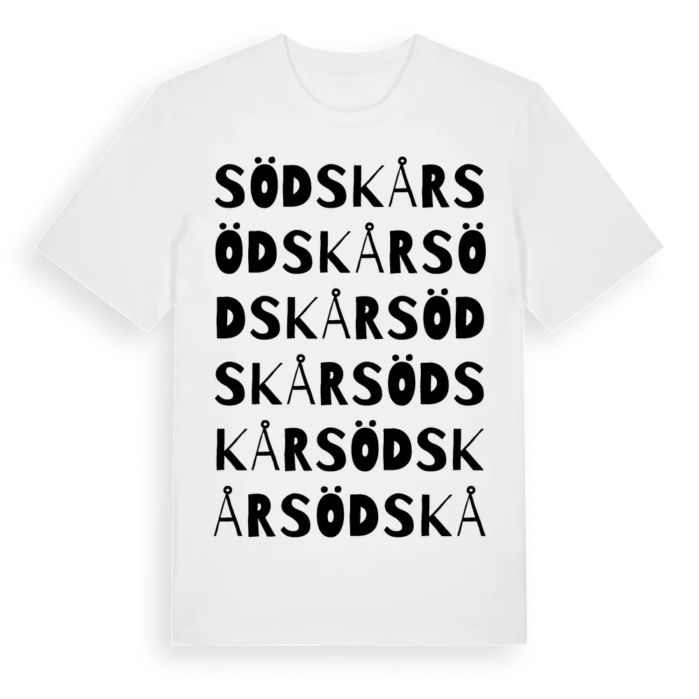Södskår ordlek t-shirt är inspirerad av Södskår i Västra Götalands län, Sverige. Tröjan är designad för dig som har en speciell koppling till platsen – oavsett om du bor här, har rötterna här eller bara älskar Södskår.