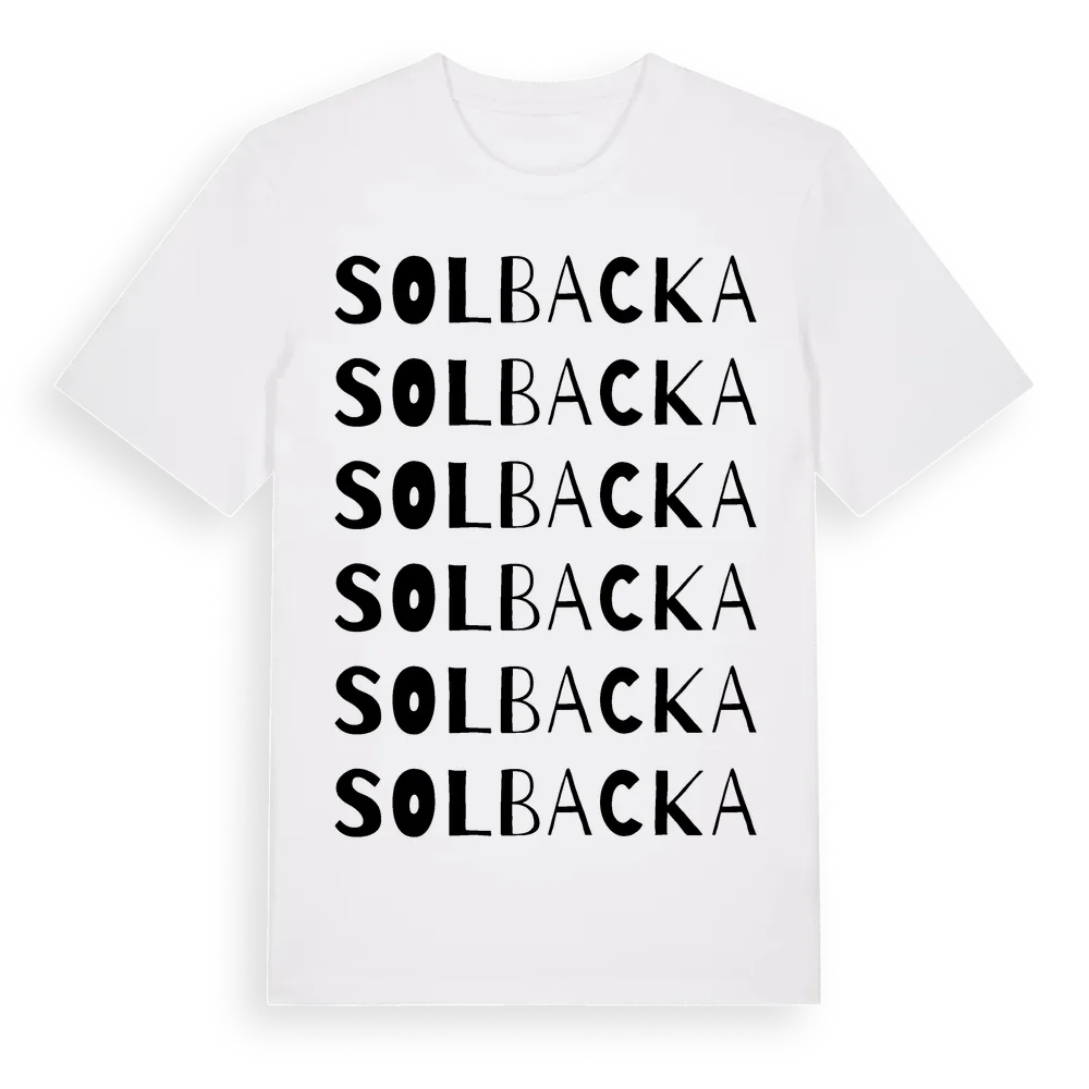 En ordlek byggd på Solbackas namn. Subtilt och klurig – ett motiv som bara de som verkligen känner platsen fullt ut förstår. Premium bomull, unisex – från Solbacka i Västra Götalands län.