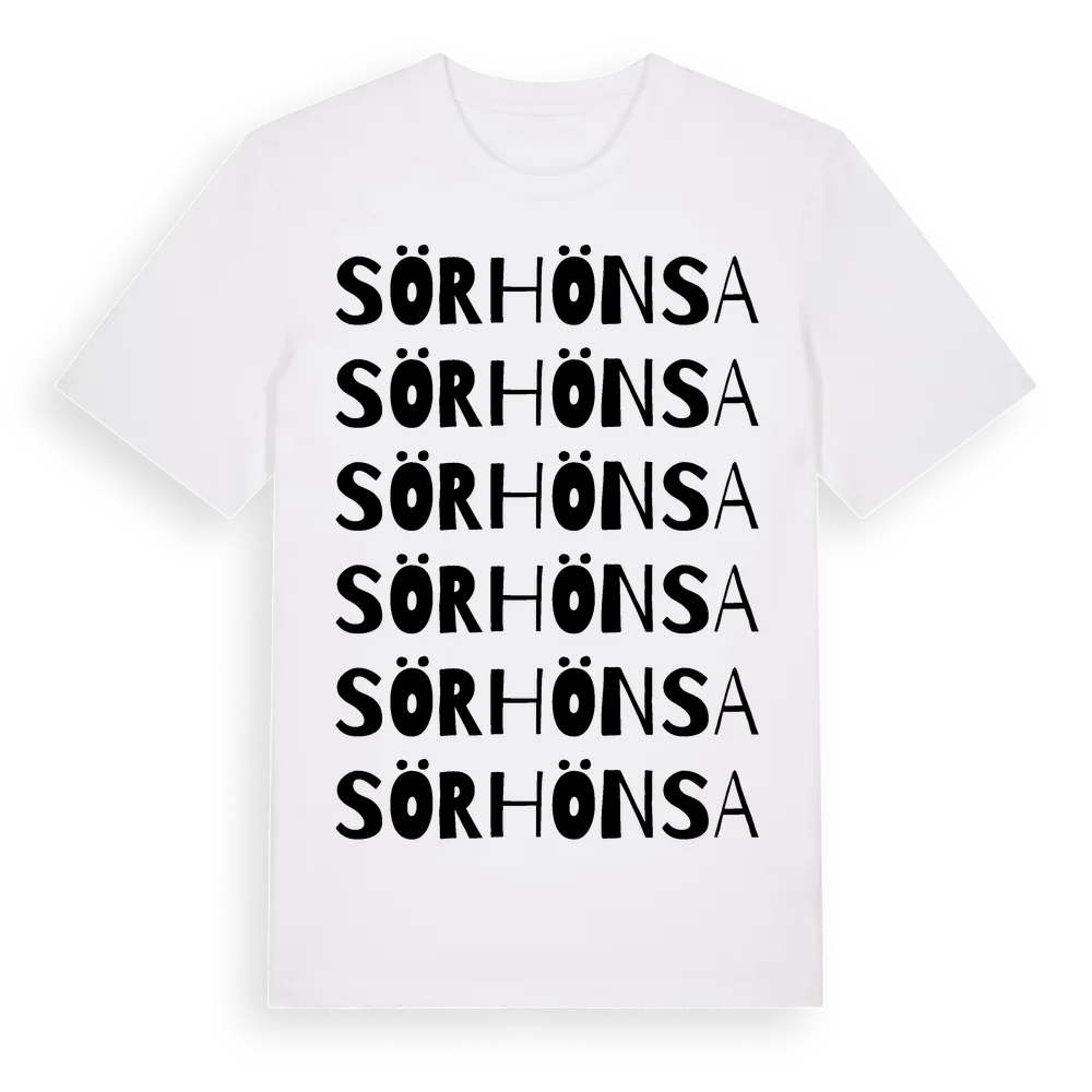 Sörhönsa ordlek t-shirt är inspirerad av Sörhönsa i Västra Götalands län, Sverige. Tröjan är designad för dig som har en speciell koppling till platsen – oavsett om du bor här, har rötterna här eller bara älskar Sörhönsa.