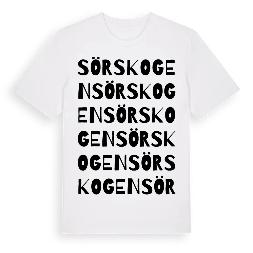 Sörskogen ordlek t-shirt är inspirerad av Sörskogen i Västra Götalands län, Sverige. Tröjan är designad för dig som har en speciell koppling till platsen – oavsett om du bor här, har rötterna här eller bara älskar Sörskogen.