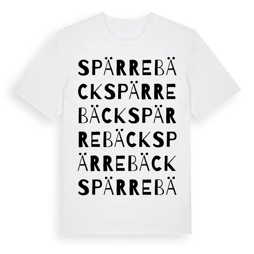 Spärrebäck ordlek t-shirt är inspirerad av Spärrebäck i Västra Götalands län, Sverige. Tröjan är designad för dig som har en speciell koppling till platsen – oavsett om du bor här, har rötterna här eller bara älskar Spärrebäck.