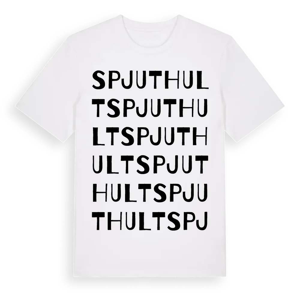 Spjuthult ordlek t-shirt är inspirerad av byn Spjuthult i Västra Götalands län, Sverige. Tröjan är designad för dig som har en speciell koppling till platsen – oavsett om du bor här, har rötterna här eller bara älskar Spjuthult.