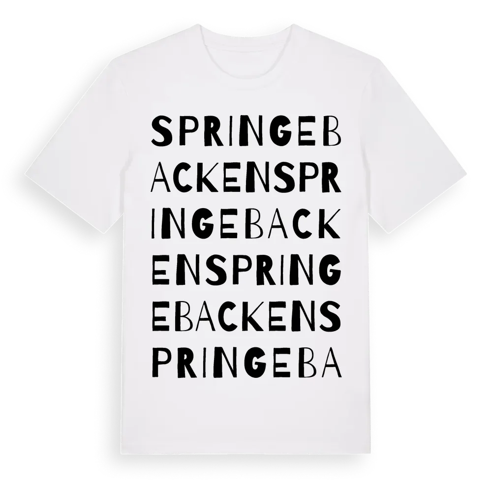 En ordlek byggd på Springebackens namn. Subtilt och klurig – ett motiv som bara de som verkligen känner platsen fullt ut förstår. Premium bomull, unisex – från Springebacken i Västra Götalands län.