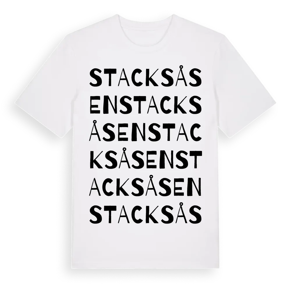 Stacksåsen ordlek t-shirt är inspirerad av Stacksåsen i Västra Götalands län, Sverige. Tröjan är designad för dig som har en speciell koppling till platsen – oavsett om du bor här, har rötterna här eller bara älskar Stacksåsen.