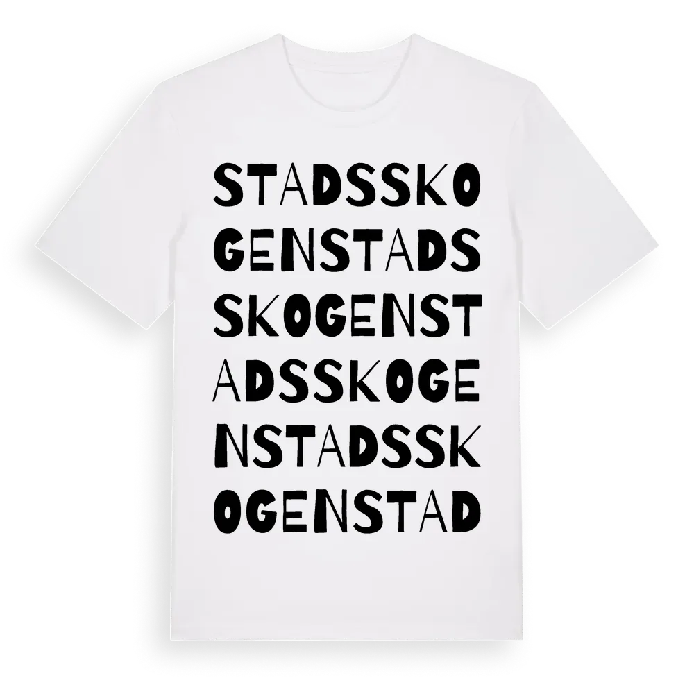 Stadsskogen ordlek t-shirt är inspirerad av stadsdelen Stadsskogen i Västra Götalands län, Sverige. Tröjan är designad för dig som har en speciell koppling till platsen – oavsett om du bor här, har rötterna här eller bara älskar Stadsskogen.