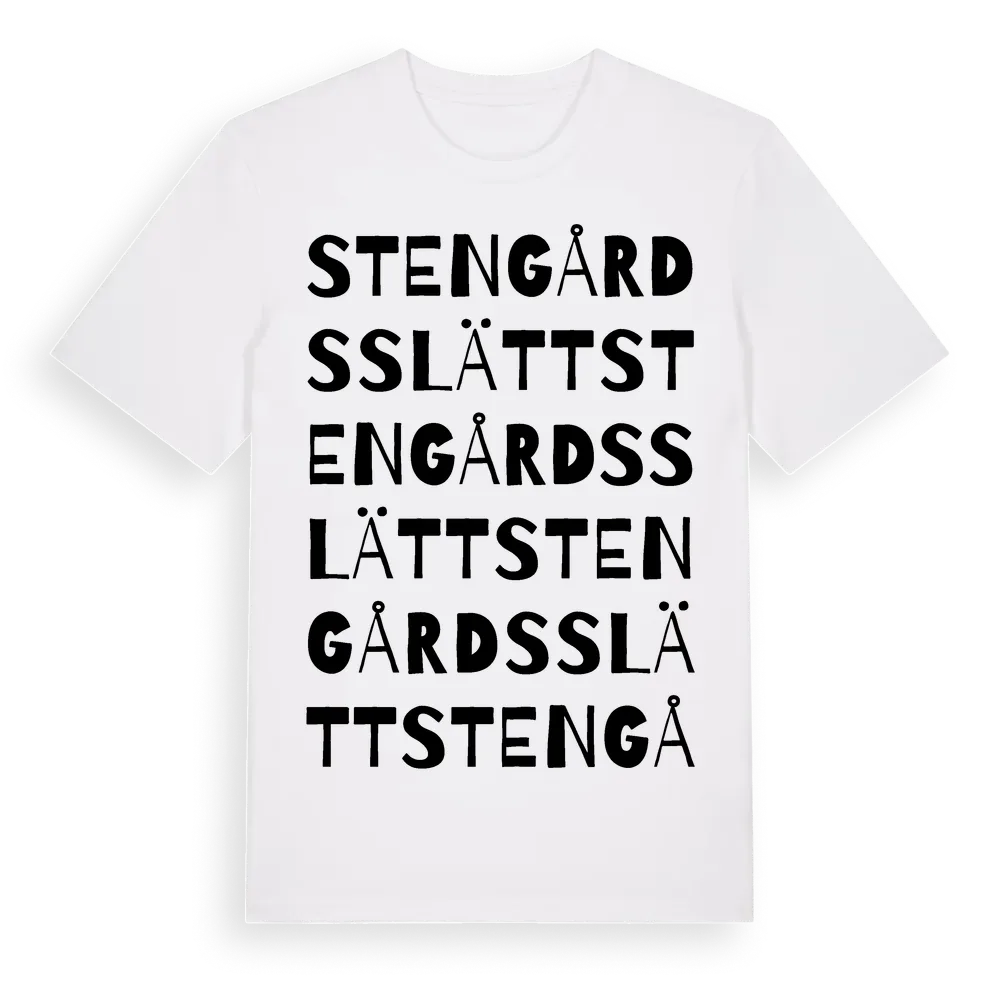 Stengårdsslätt ordlek t-shirt är inspirerad av Stengårdsslätt i Västra Götalands län, Sverige. Tröjan är designad för dig som har en speciell koppling till platsen – oavsett om du bor här, har rötterna här eller bara älskar Stengårdsslätt.