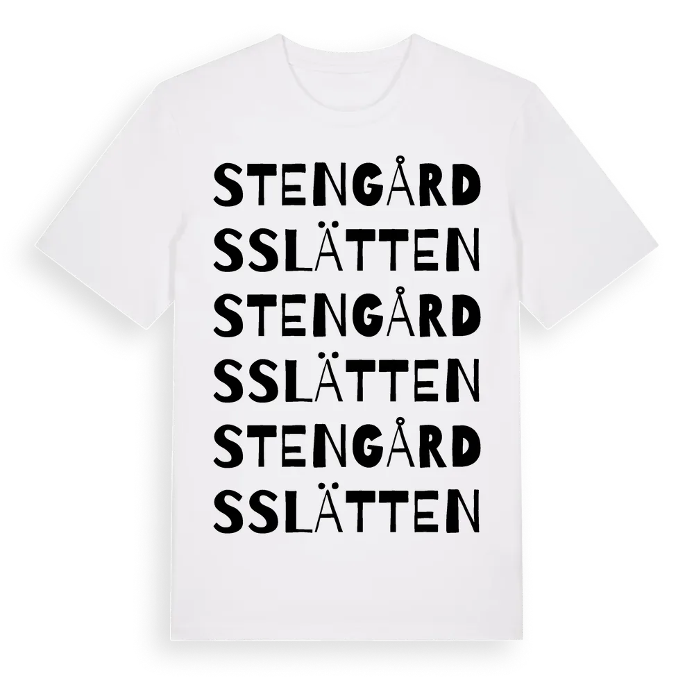 Stengårdsslätten ordlek t-shirt är inspirerad av Stengårdsslätten i Västra Götalands län, Sverige. Tröjan är designad för dig som har en speciell koppling till platsen – oavsett om du bor här, har rötterna här eller bara älskar Stengårdsslätten.