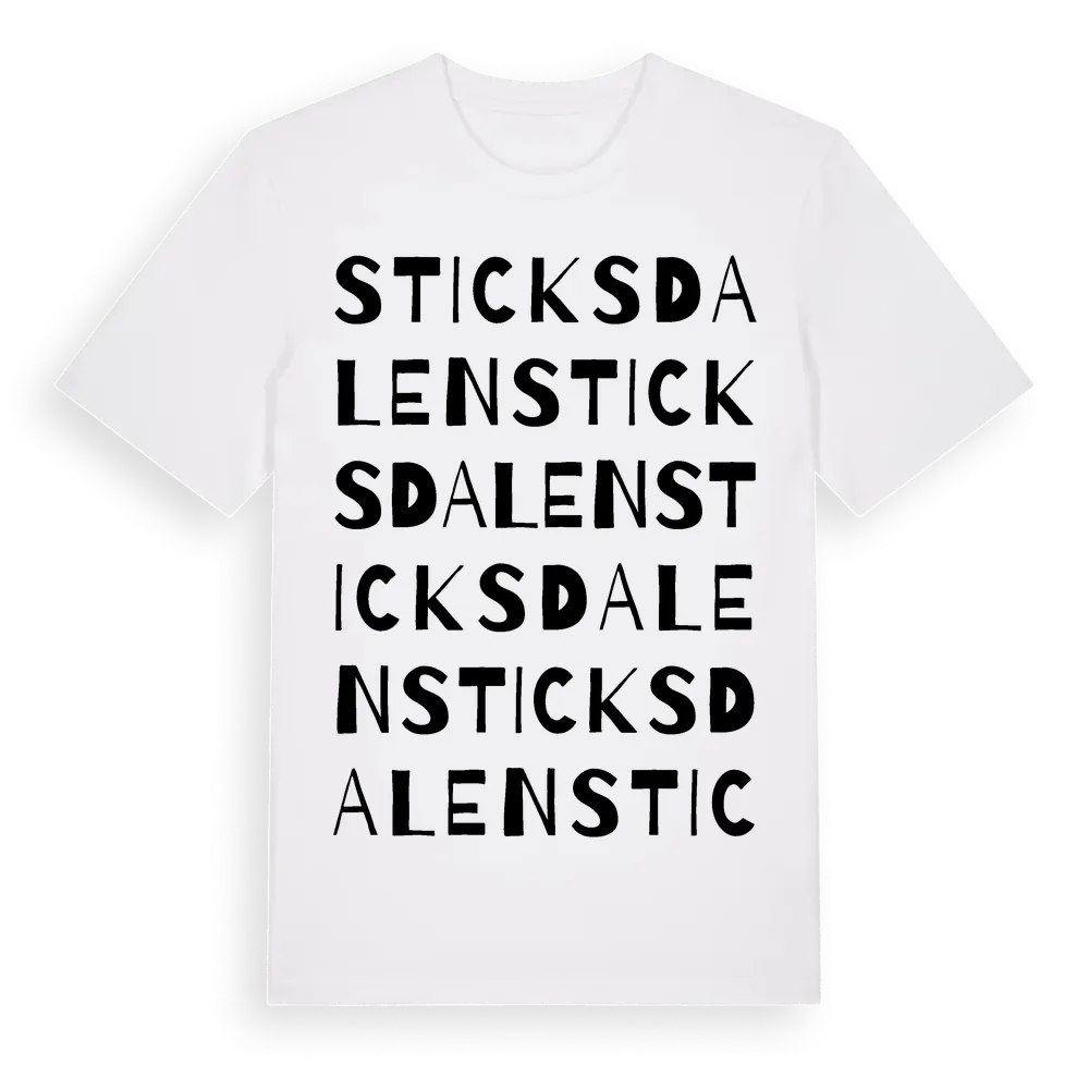 En ordlek byggd på Sticksdalens namn. Subtilt och klurig – ett motiv som bara de som verkligen känner platsen fullt ut förstår. Premium bomull, unisex – från Sticksdalen i Västra Götalands län.