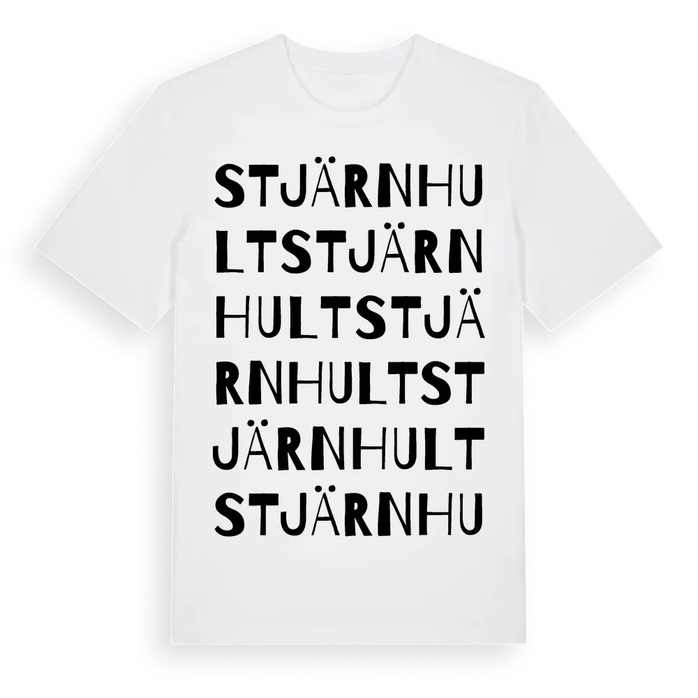 Stjärnhult ordlek t-shirt är inspirerad av Stjärnhult i Västra Götalands län, Sverige. Tröjan är designad för dig som har en speciell koppling till platsen – oavsett om du bor här, har rötterna här eller bara älskar Stjärnhult.