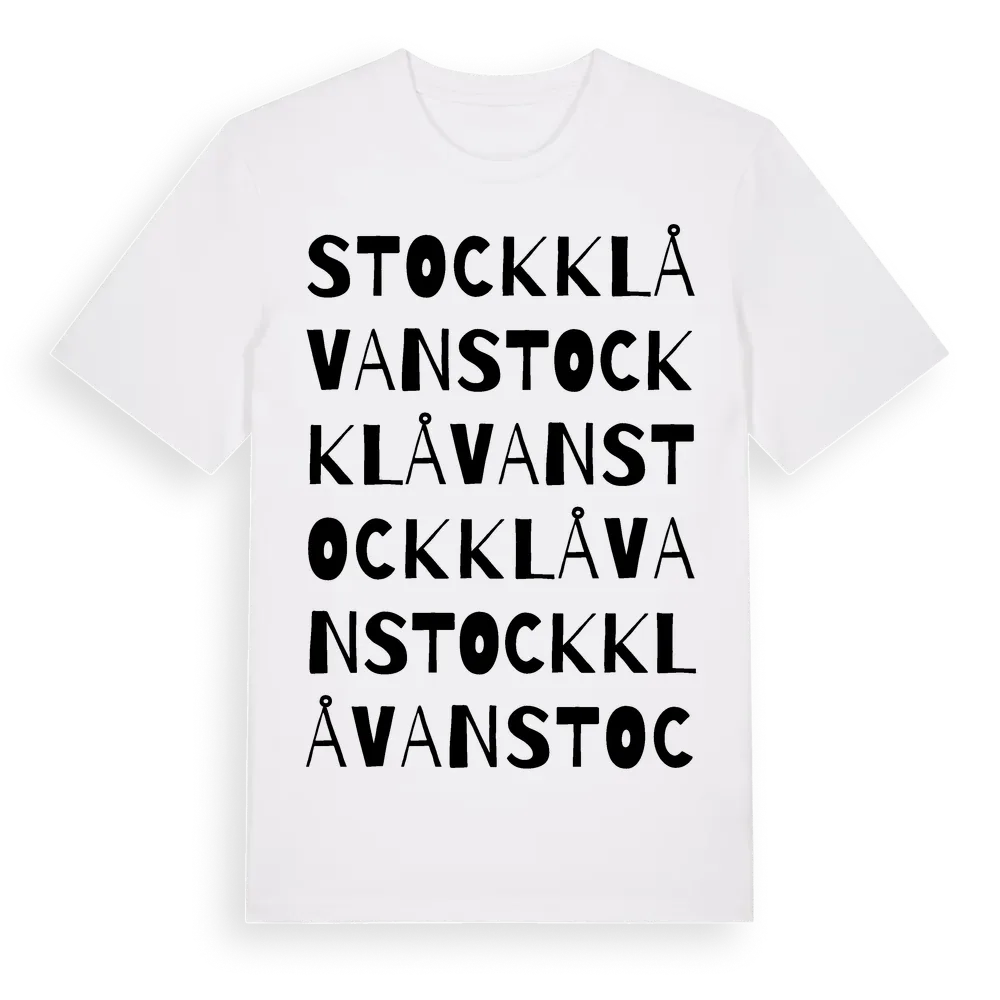 Stockklåvan ordlek t-shirt är inspirerad av Stockklåvan i Västra Götalands län, Sverige. Tröjan är designad för dig som har en speciell koppling till platsen – oavsett om du bor här, har rötterna här eller bara älskar Stockklåvan.