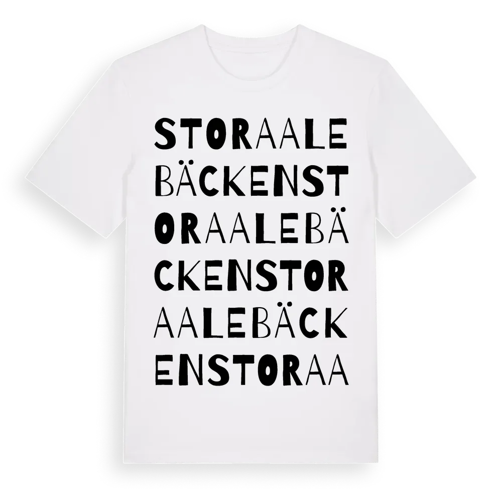 Stora Alebäcken ordlek t-shirt är inspirerad av byn Stora Alebäcken i Västra Götalands län, Sverige. Tröjan är designad för dig som har en speciell koppling till platsen – oavsett om du bor här, har rötterna här eller bara älskar Stora Alebäcken.