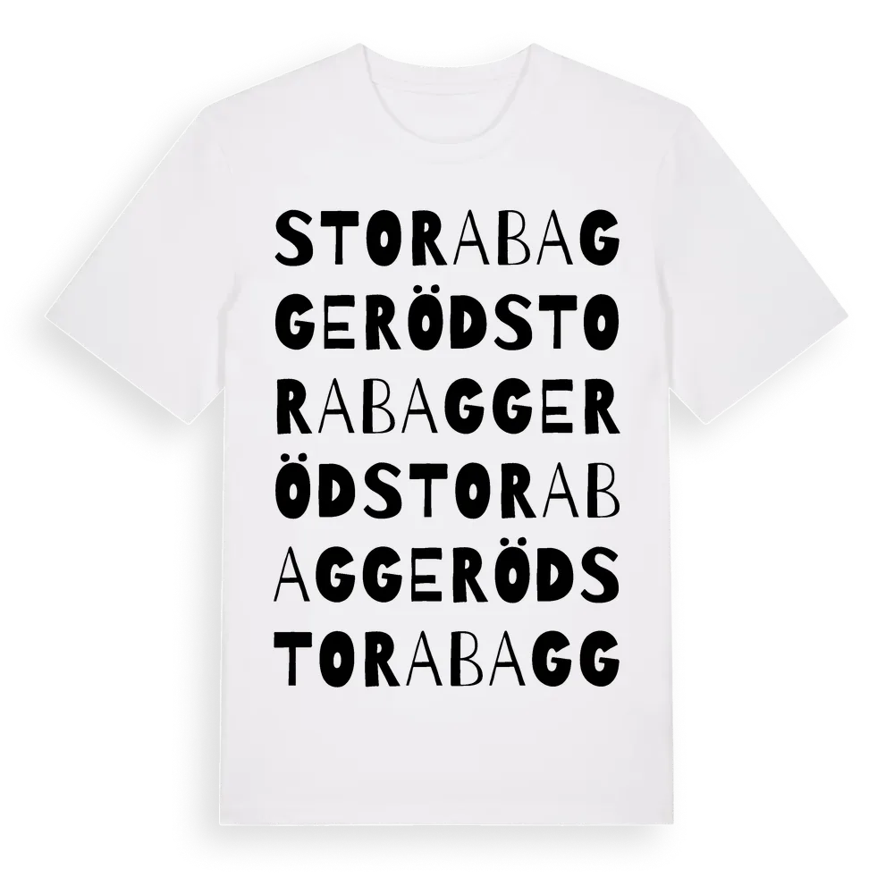 Stora Baggeröd ordlek t-shirt är inspirerad av byn Stora Baggeröd i Västra Götalands län, Sverige. Tröjan är designad för dig som har en speciell koppling till platsen – oavsett om du bor här, har rötterna här eller bara älskar Stora Baggeröd.