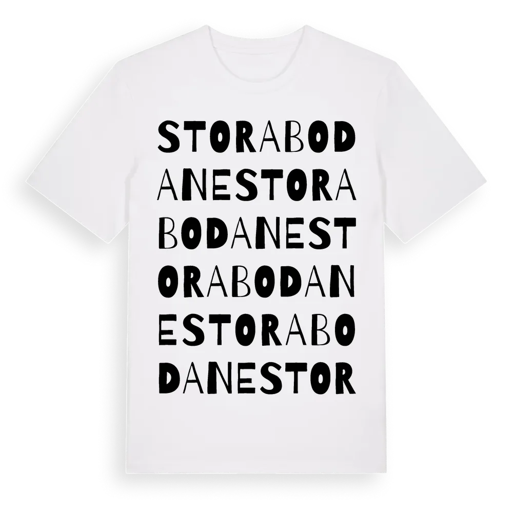 Stora Bodane ordlek t-shirt är inspirerad av byn Stora Bodane i Västra Götalands län, Sverige. Tröjan är designad för dig som har en speciell koppling till platsen – oavsett om du bor här, har rötterna här eller bara älskar Stora Bodane.