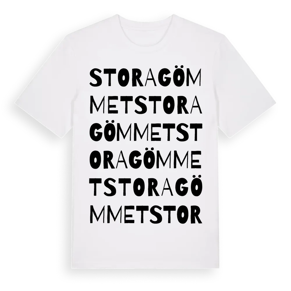 Stora Gömmet ordlek t-shirt är inspirerad av Stora Gömmet i Västra Götalands län, Sverige. Tröjan är designad för dig som har en speciell koppling till platsen – oavsett om du bor här, har rötterna här eller bara älskar Stora Gömmet.