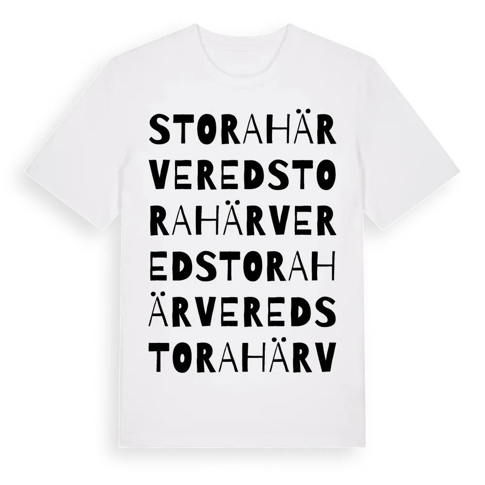 Stora Härvered ordlek t-shirt är inspirerad av Stora Härvered i Västra Götalands län, Sverige. Tröjan är designad för dig som har en speciell koppling till platsen – oavsett om du bor här, har rötterna här eller bara älskar Stora Härvered.