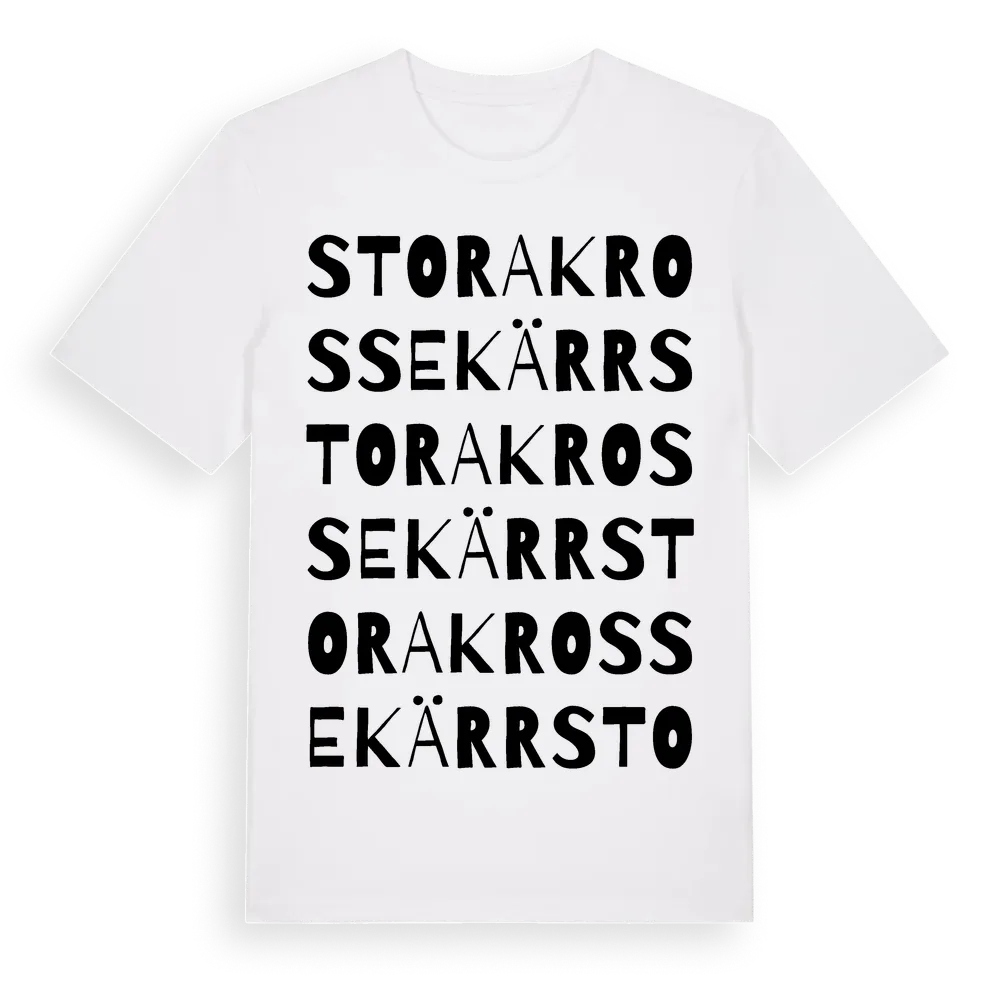 Stora Krossekärr ordlek t-shirt är inspirerad av byn Stora Krossekärr i Västra Götalands län, Sverige. Tröjan är designad för dig som har en speciell koppling till platsen – oavsett om du bor här, har rötterna här eller bara älskar Stora Krossekärr.