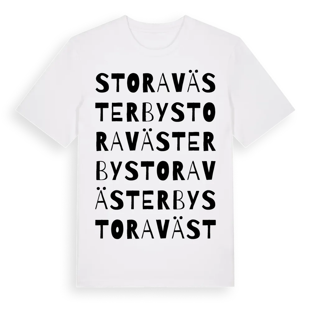 Stora Västerby ordlek t-shirt är inspirerad av Stora Västerby i Västra Götalands län, Sverige. Tröjan är designad för dig som har en speciell koppling till platsen – oavsett om du bor här, har rötterna här eller bara älskar Stora Västerby.
