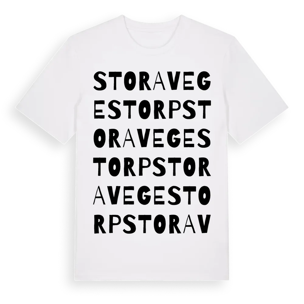 Stora Vegestorp ordlek t-shirt är inspirerad av Stora Vegestorp i Västra Götalands län, Sverige. Tröjan är designad för dig som har en speciell koppling till platsen – oavsett om du bor här, har rötterna här eller bara älskar Stora Vegestorp.