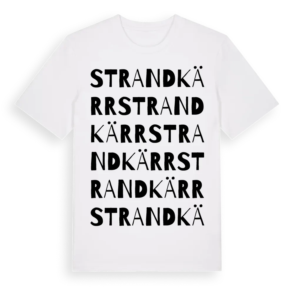 Strandkärr ordlek t-shirt är inspirerad av Strandkärr i Västra Götalands län, Sverige. Tröjan är designad för dig som har en speciell koppling till platsen – oavsett om du bor här, har rötterna här eller bara älskar Strandkärr.