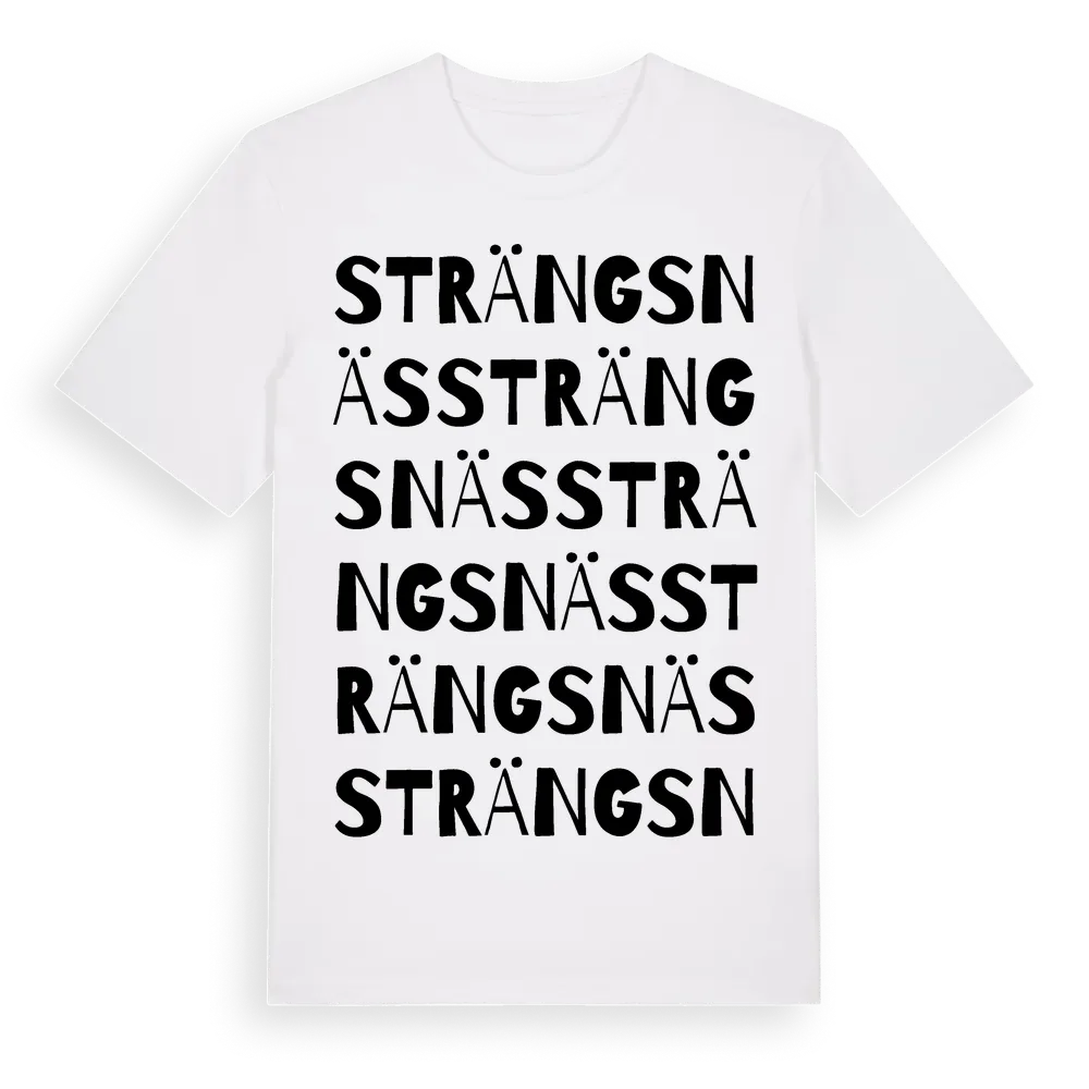 En ordlek byggd på Strängsnäss namn. Subtilt och klurig – ett motiv som bara de som verkligen känner platsen fullt ut förstår. Premium bomull, unisex – från Strängsnäs i Västra Götalands län.