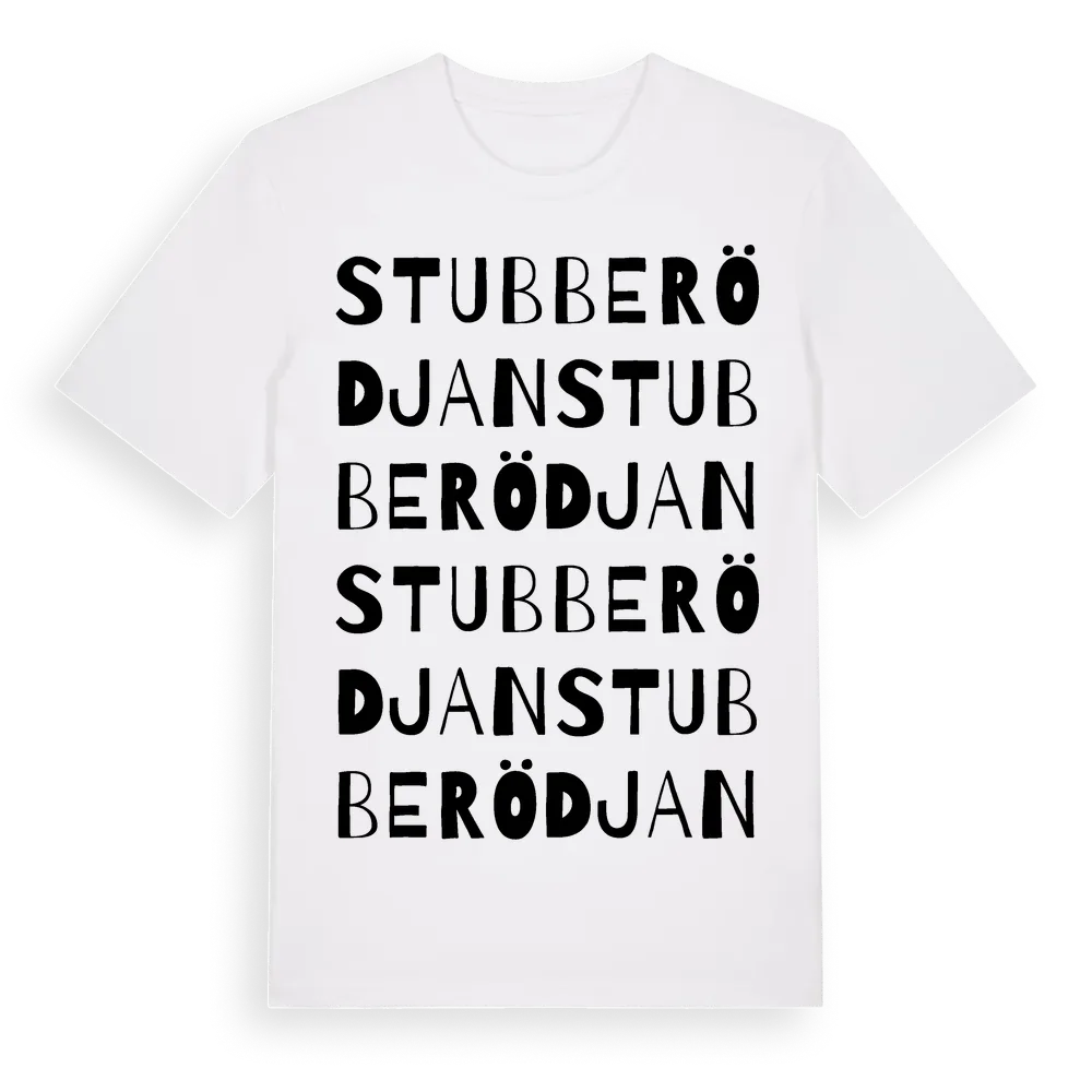 Stubberödjan ordlek t-shirt är inspirerad av Stubberödjan i Västra Götalands län, Sverige. Tröjan är designad för dig som har en speciell koppling till platsen – oavsett om du bor här, har rötterna här eller bara älskar Stubberödjan.