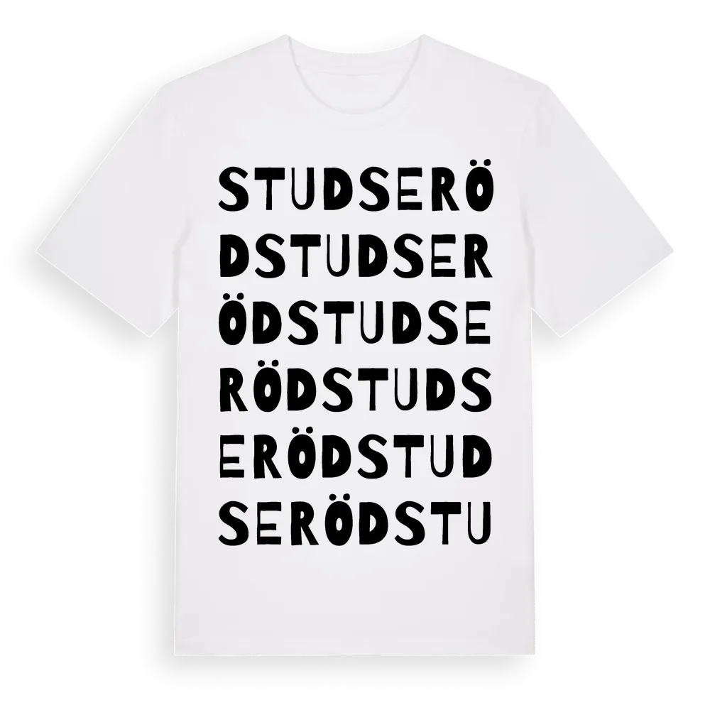 Studseröd ordlek t-shirt är inspirerad av byn Studseröd i Västra Götalands län, Sverige. Tröjan är designad för dig som har en speciell koppling till platsen – oavsett om du bor här, har rötterna här eller bara älskar Studseröd.