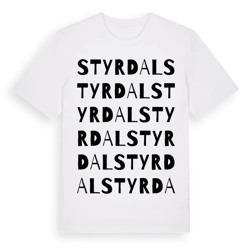 Styrdal ordlek t-shirt är inspirerad av Styrdal i Västra Götalands län, Sverige. Tröjan är designad för dig som har en speciell koppling till platsen – oavsett om du bor här, har rötterna här eller bara älskar Styrdal.