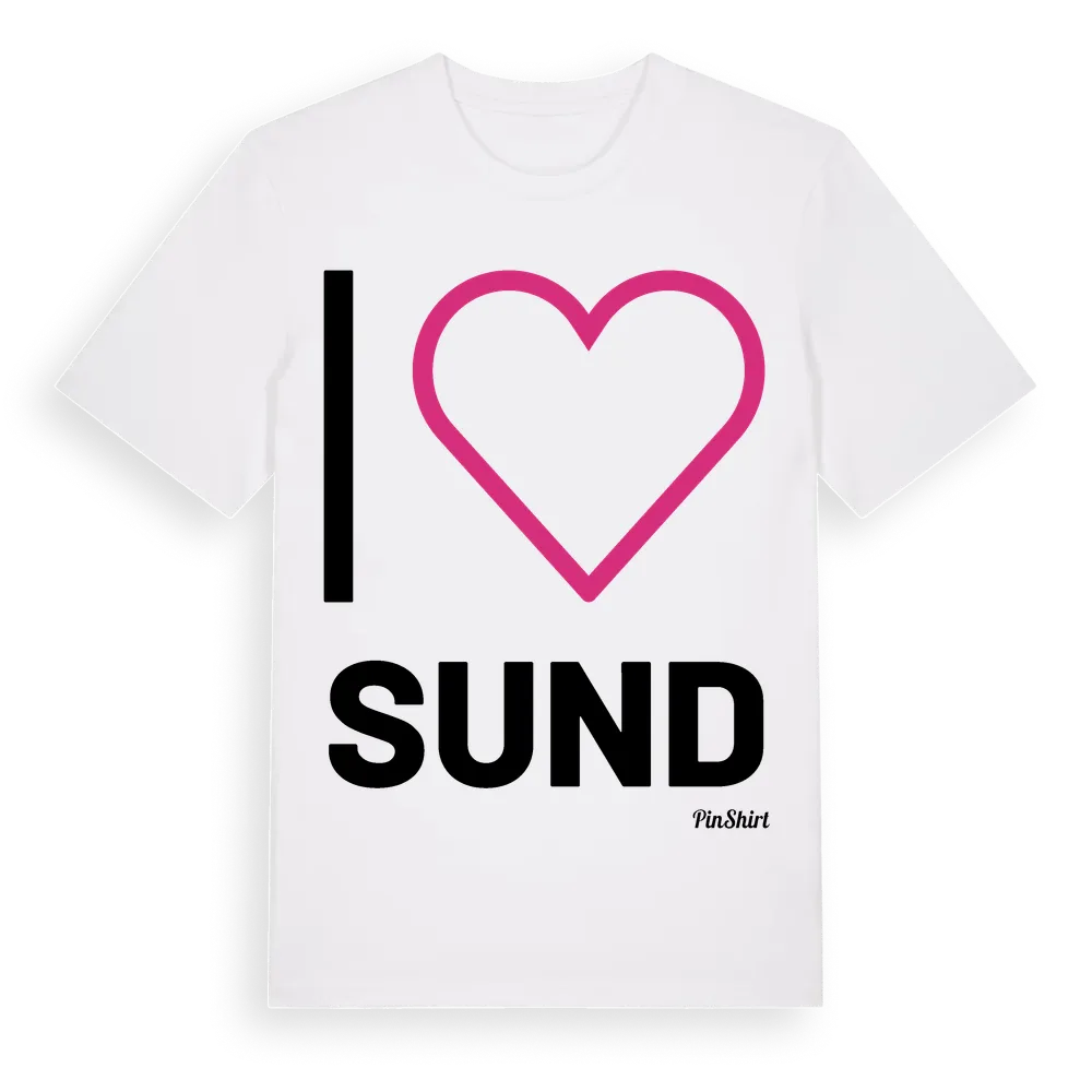 Det klassiska "I ❤ Sund"-motivet i stort format som täcker hela bröstet. För dig som vill visa kärleken till Sund på riktigt. Premium bomull, unisex – från byn Sund i Västra Götalands län.