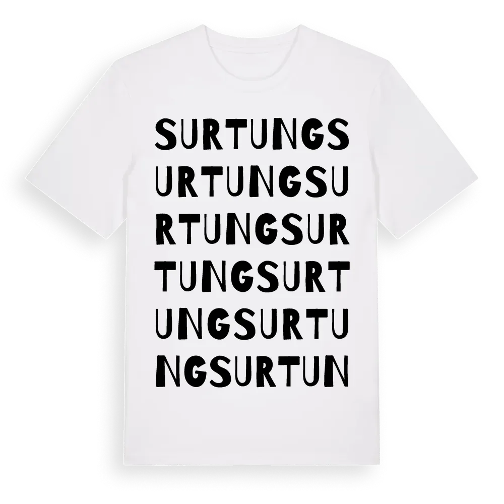En ordlek byggd på Surtungs namn. Subtilt och klurig – ett motiv som bara de som verkligen känner platsen fullt ut förstår. Premium bomull, unisex – från Surtung i Västra Götalands län.