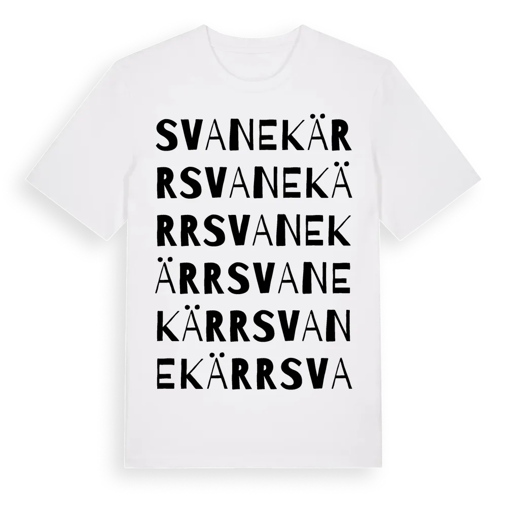 Svanekärr ordlek t-shirt är inspirerad av Svanekärr i Västra Götalands län, Sverige. Tröjan är designad för dig som har en speciell koppling till platsen – oavsett om du bor här, har rötterna här eller bara älskar Svanekärr.