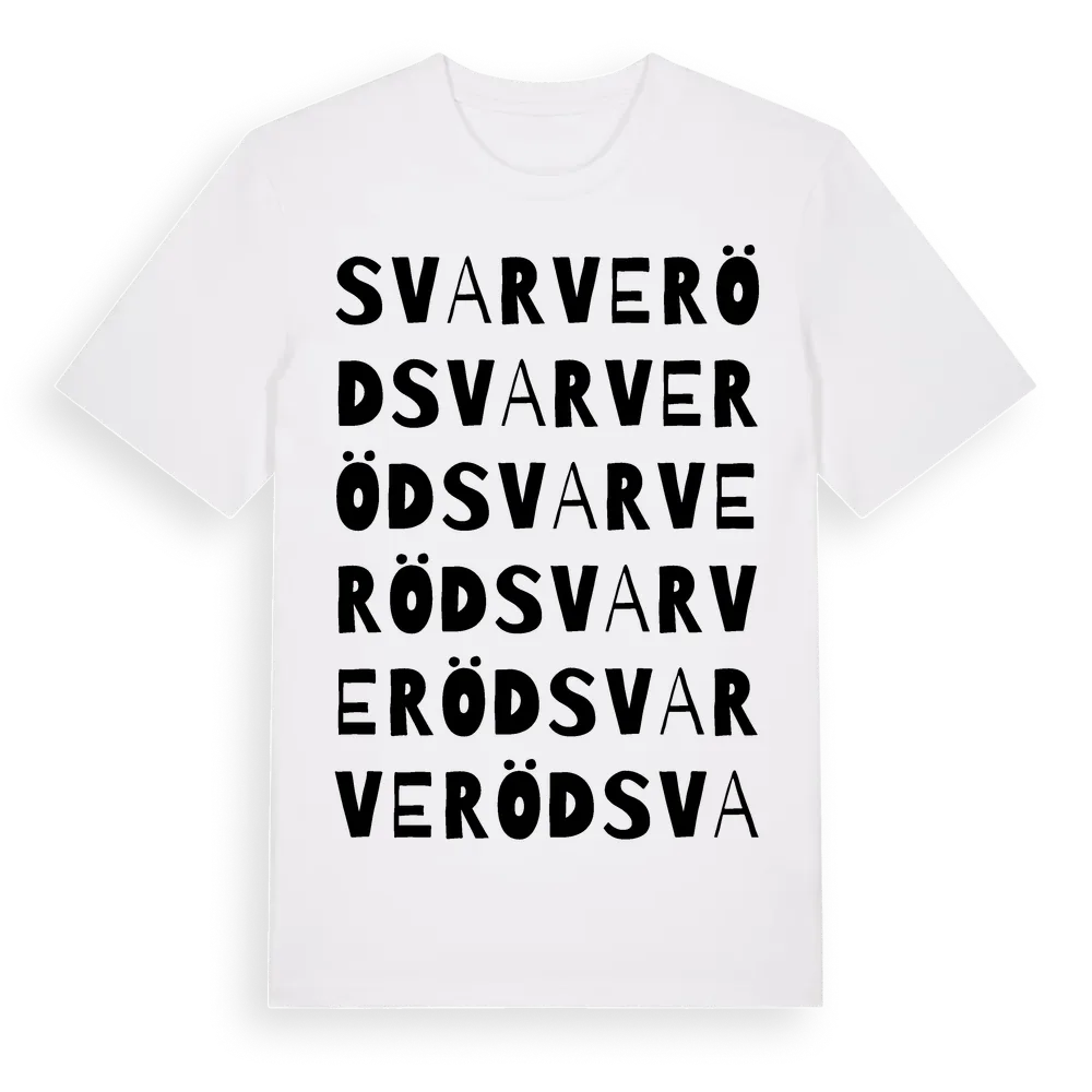 Svarveröd ordlek t-shirt är inspirerad av Svarveröd i Västra Götalands län, Sverige. Tröjan är designad för dig som har en speciell koppling till platsen – oavsett om du bor här, har rötterna här eller bara älskar Svarveröd.