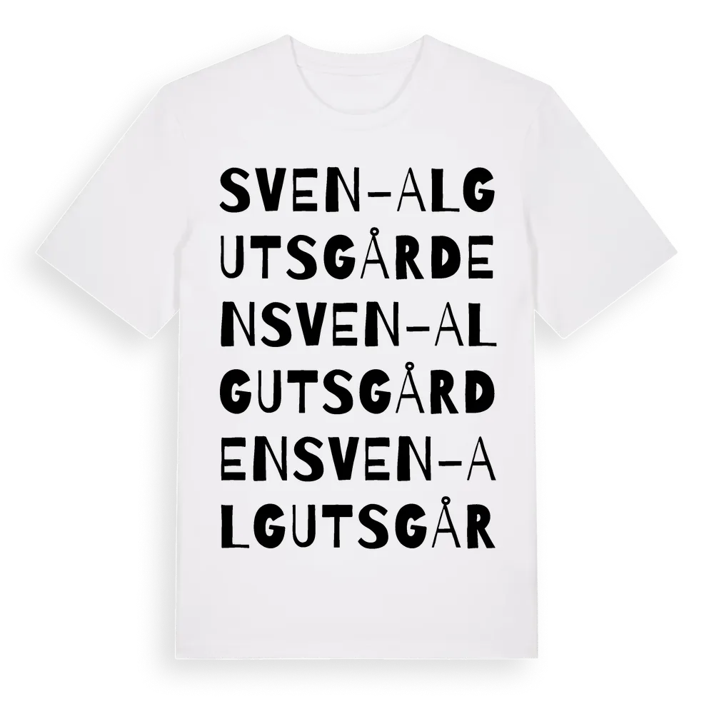Sven-Algutsgården ordlek t-shirt är inspirerad av Sven-Algutsgården i Västra Götalands län, Sverige. Tröjan är designad för dig som har en speciell koppling till platsen – oavsett om du bor här, har rötterna här eller bara älskar Sven-Algutsgården.