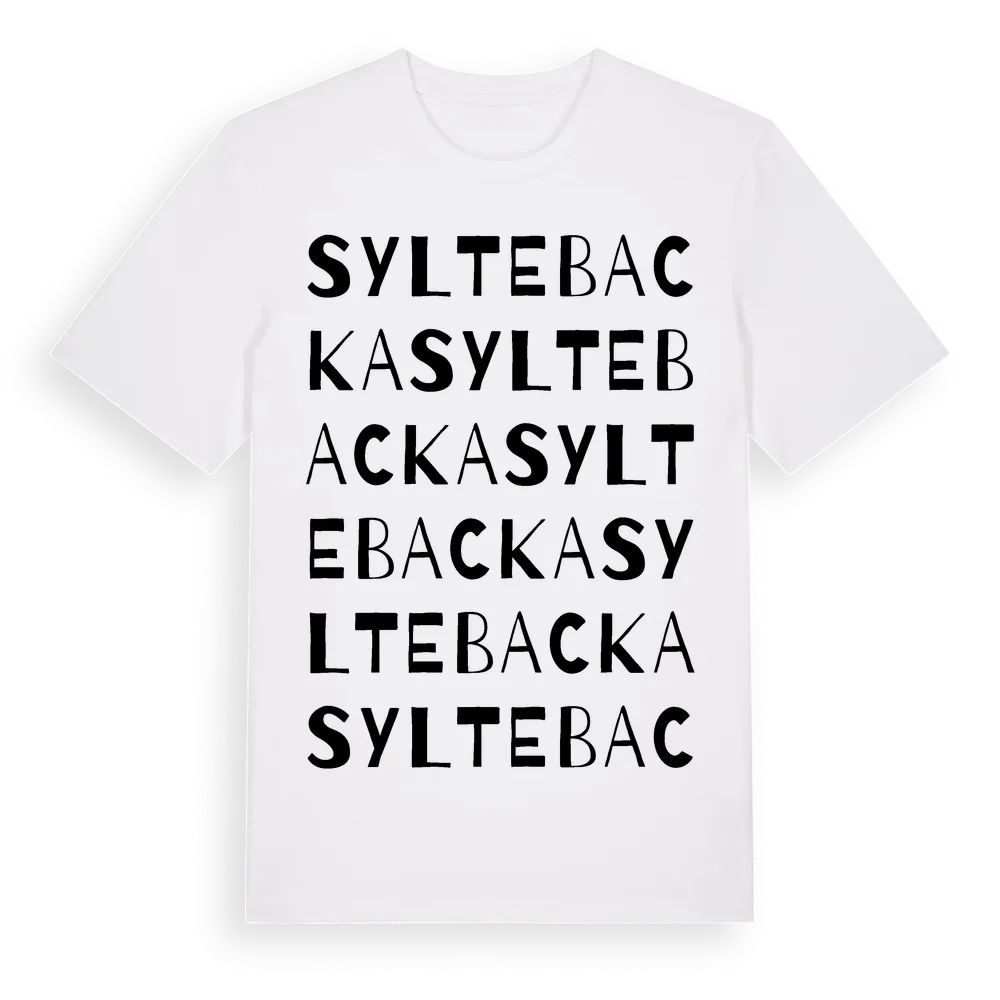 Syltebacka ordlek t-shirt är inspirerad av Syltebacka i Västra Götalands län, Sverige. Tröjan är designad för dig som har en speciell koppling till platsen – oavsett om du bor här, har rötterna här eller bara älskar Syltebacka.