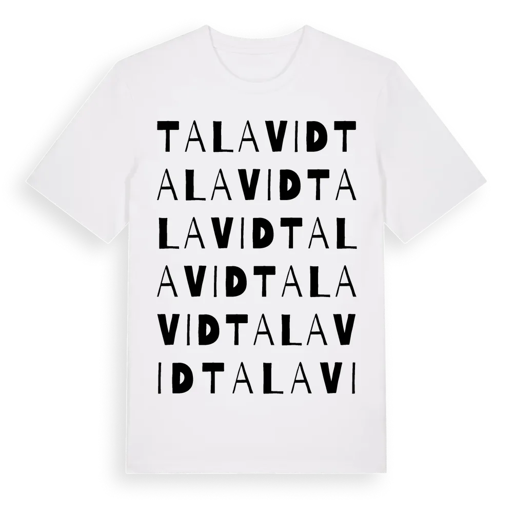 Talavid ordlek t-shirt är inspirerad av Talavid i Västra Götalands län, Sverige. Tröjan är designad för dig som har en speciell koppling till platsen – oavsett om du bor här, har rötterna här eller bara älskar Talavid.