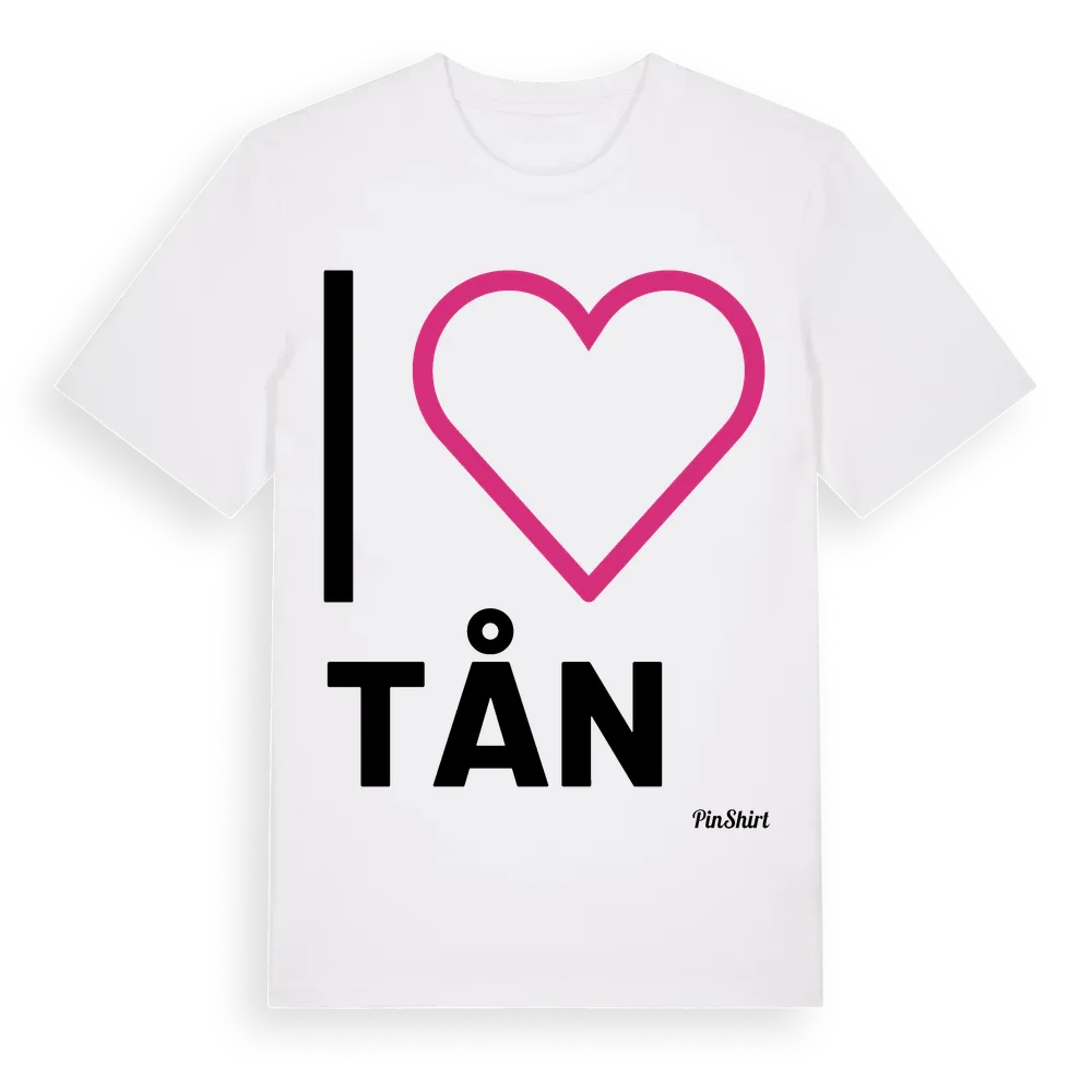 Det klassiska "I ❤ Tån"-motivet i stort format som täcker hela bröstet. För dig som vill visa kärleken till Tån på riktigt. Premium bomull, unisex – från Tån i Västra Götalands län.