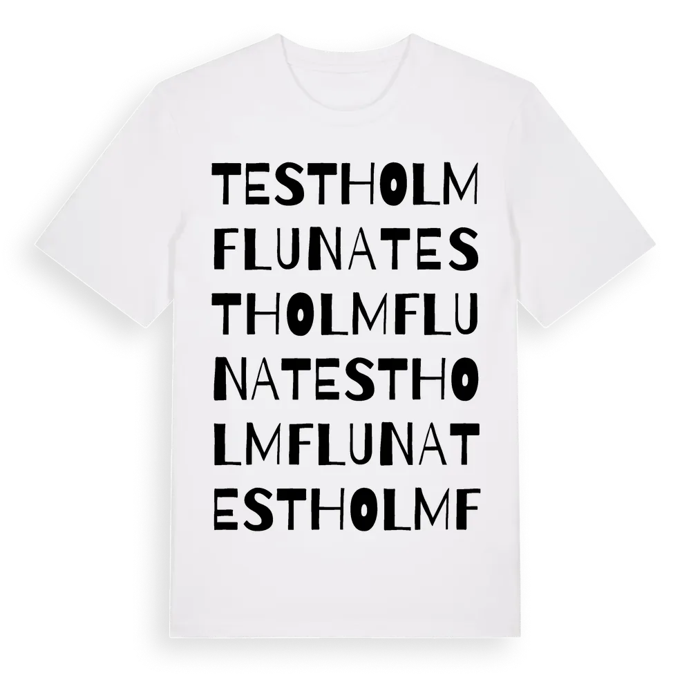 Testholmfluna ordlek t-shirt är inspirerad av Testholmfluna i Västra Götalands län, Sverige. Tröjan är designad för dig som har en speciell koppling till platsen – oavsett om du bor här, har rötterna här eller bara älskar Testholmfluna.