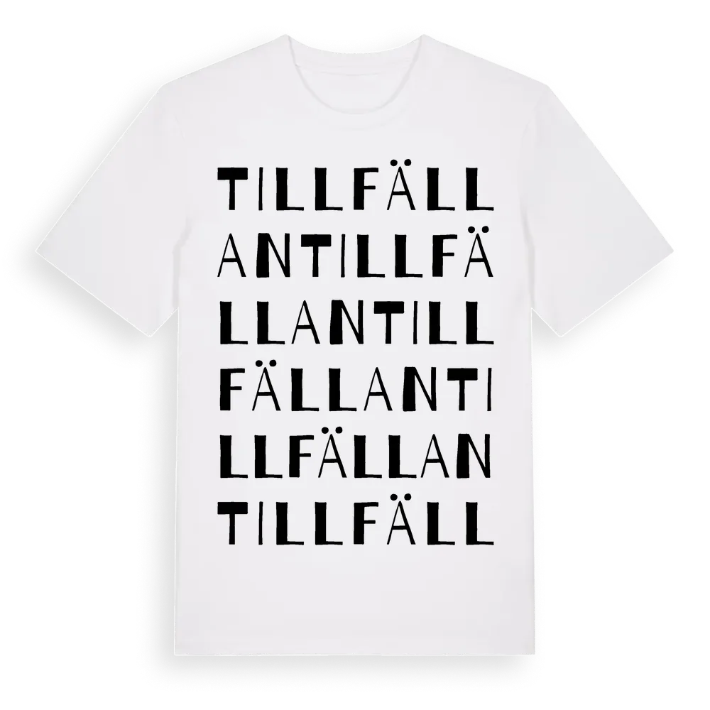 Tillfällan ordlek t-shirt är inspirerad av Tillfällan i Västra Götalands län, Sverige. Tröjan är designad för dig som har en speciell koppling till platsen – oavsett om du bor här, har rötterna här eller bara älskar Tillfällan.