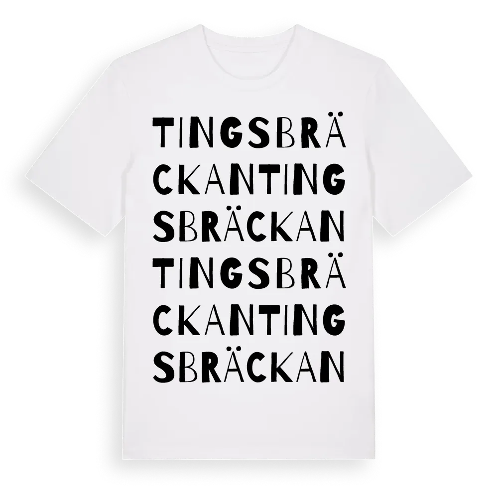 Tingsbräckan ordlek t-shirt är inspirerad av Tingsbräckan i Västra Götalands län, Sverige. Tröjan är designad för dig som har en speciell koppling till platsen – oavsett om du bor här, har rötterna här eller bara älskar Tingsbräckan.