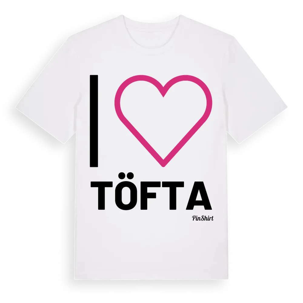 Det klassiska "I ❤ Töfta"-motivet i stort format som täcker hela bröstet. För dig som vill visa kärleken till Töfta på riktigt. Premium bomull, unisex – från byn Töfta i Västra Götalands län.