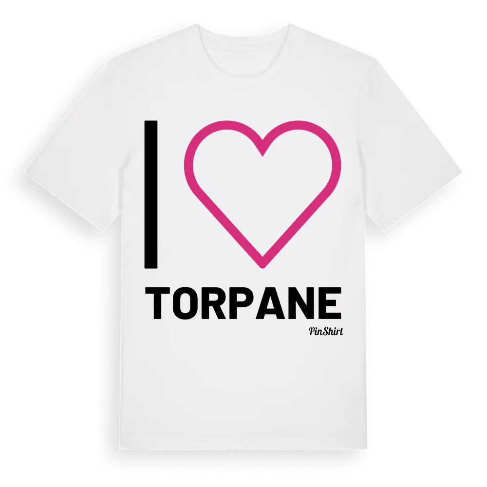 Det klassiska "I ❤ Torpane"-motivet i stort format som täcker hela bröstet. För dig som vill visa kärleken till Torpane på riktigt. Premium bomull, unisex – från byn Torpane i Västra Götalands län.